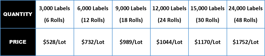 We offer price breaks based on higher quantities! For orders over 20,000 labels - call 800-458-2390